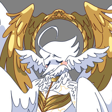✦ His body is covered in soft white fur. He has wings on his back, his ankles and what would be his ears.